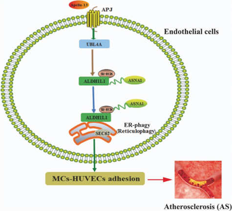 该团队于2010年发现,Apelin/APJ系统能促进单核细胞向血管内皮粘附,其主要通过激活14-3-3信号途径实现。2018年,团队进一步发现ROS -自噬途径可介导Apelin-13/APJ对单核细胞-血管内皮细胞粘附的促进作用,并在此基础上深入探讨了介导这一过程的选择性自噬类型。2025年,团队首次揭示SEC62依赖的内质网自噬在Apelin-13/APJ信号通路诱导的单核细胞-内皮细胞粘附及动脉粥样硬化中的关键作用。研究发现,内质网自噬可介导Apelin-13/APJ对单核细胞-血管内皮细胞粘附的促进作用;与传统的内质网自噬受体FAM134B相比,在人脐静脉血管内皮细胞中,Apelin-13主要通过上调SEC62(作为内质网自噬受体蛋白)介导内质网自噬的发生。